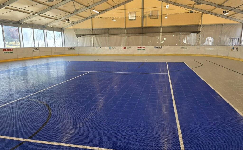 Zimowa hala lodowiska zyskała nowe, letnie oblicze — teraz przez cały rok będzie miejscem aktywności mieszkańców. Dzięki nowoczesnej, wielofunkcyjnej nawierzchni można tu nie tylko jeździć na rolkach czy wrotkach, ale też zagrać w koszykówkę i tenisa.